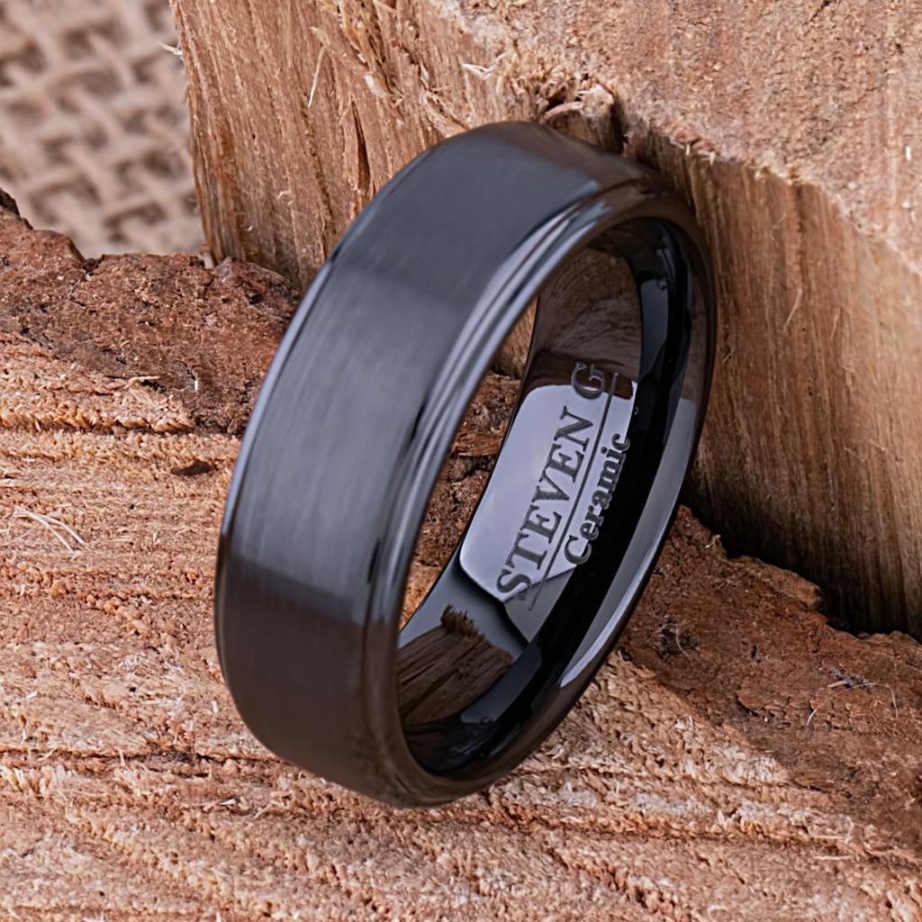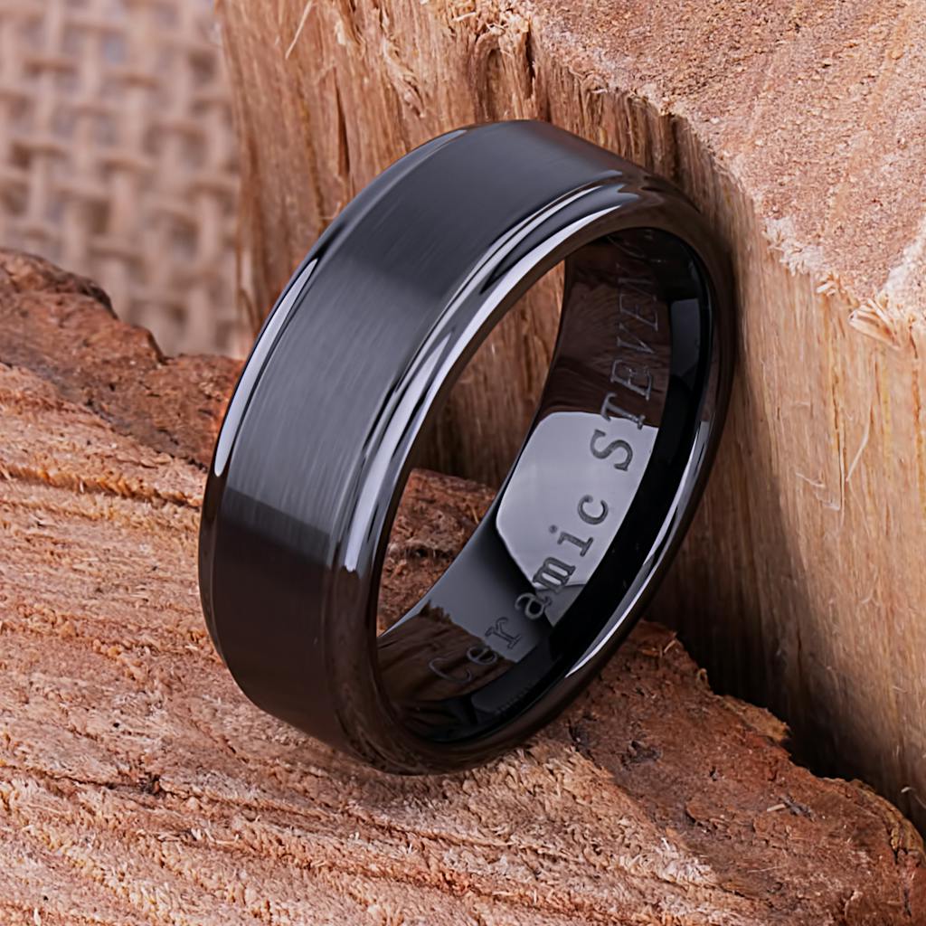Black Ceramic Ring Traditional Style Wedding Engagement Band 8mm with Flat Brushed Center & Lower Polished Sides