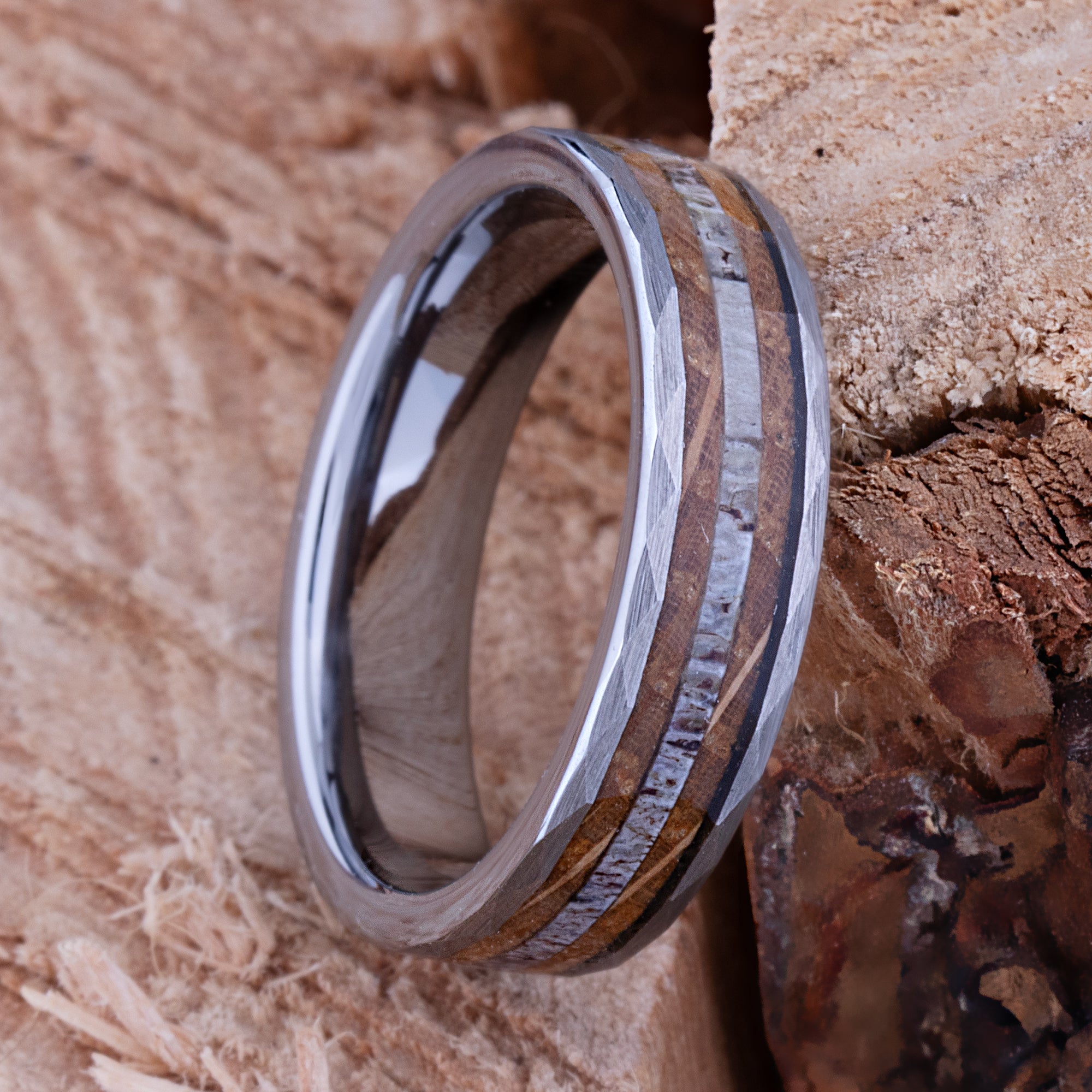 Tungsten Wedding Band 6mm: Whiskey Barrel Wood & Deer Antler Inlay - TCR107