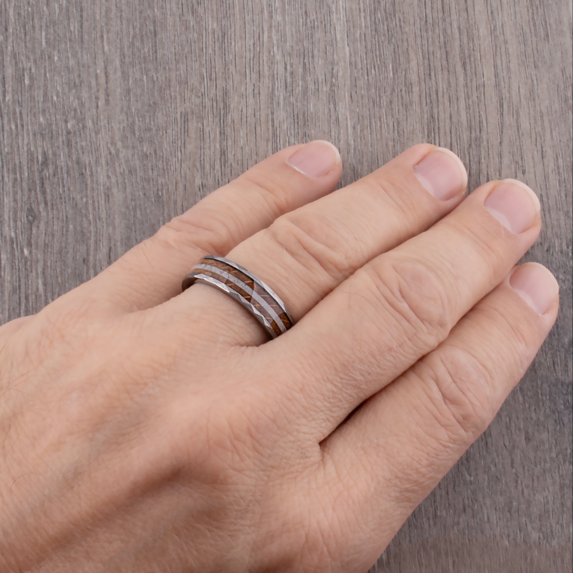 The whiskey barrel wood inlay adds a touch of rustic allure to the ring. Sourced from authentic whiskey barrels, the wood showcases the rich history and character of the barrels, creating a unique and individualized piece.