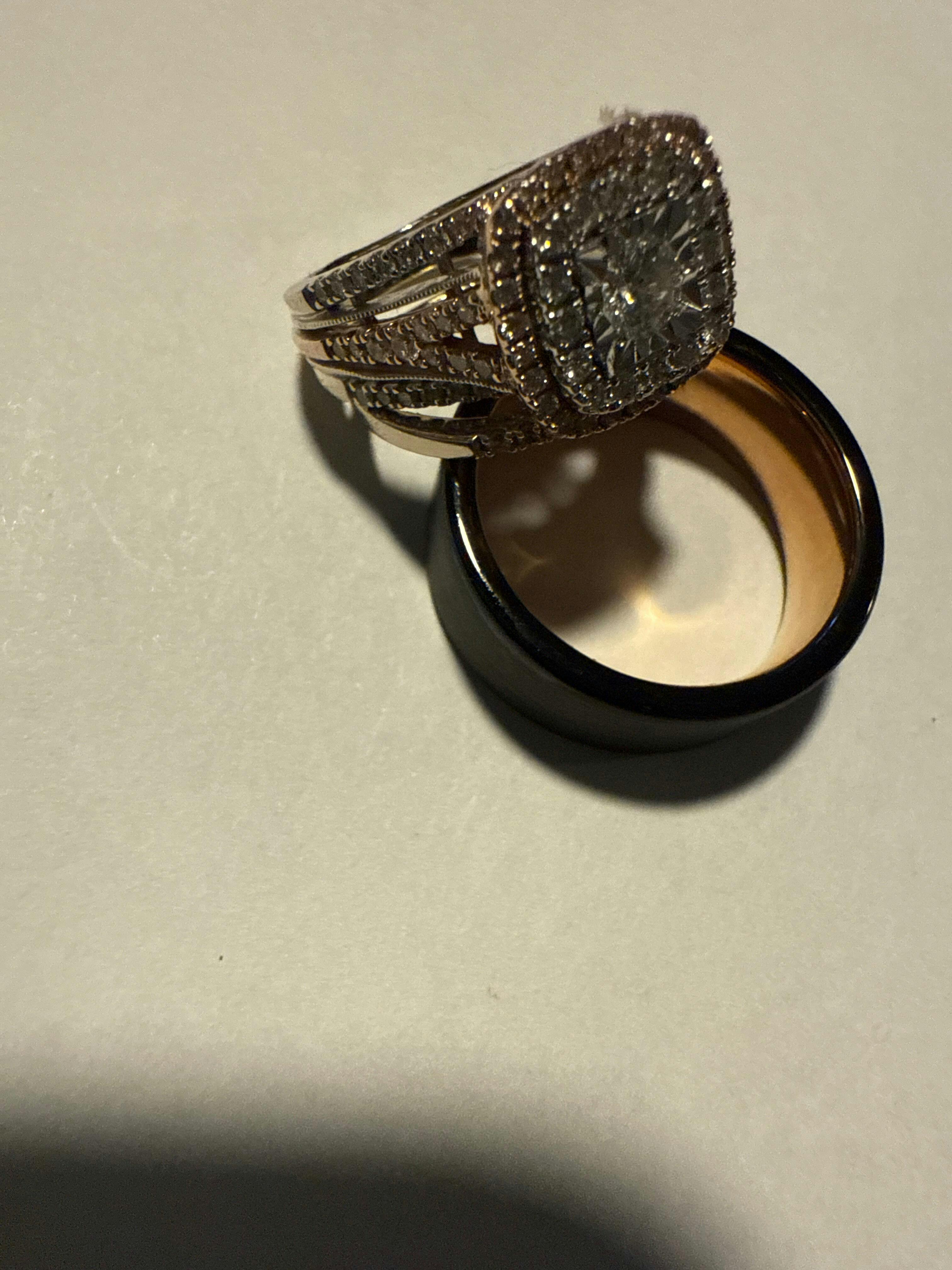 First off, when I first bought my husband ring, I didn’t realize it was coming from Canada. But when the ring finally arrived in person, OMG, the ring is stunning, sturdy & just that little extra piece we needed to complete our special story. The pictures does this ring no justice. Our package arrived on time & it also came with a cleaning cloth(also instructions), a ring sizer,(in the event the ring won’t fit), & also a beautiful free pair of white gold diamond studs earrings, an authenticity card & the kicker was, how beautiful & protected the ring arrived. The ring just didn’t came in an ordinary box. No, this beauty came double boxed & wrapped with a bow. Get that man this ring, he’ll not be unsatisfied. My rings have some rose gold color in it & now my husband band has rose gold color in the inner band!!! Gorgeous, stunning, beautiful ring!!!!! This ring have a nice weight to it.