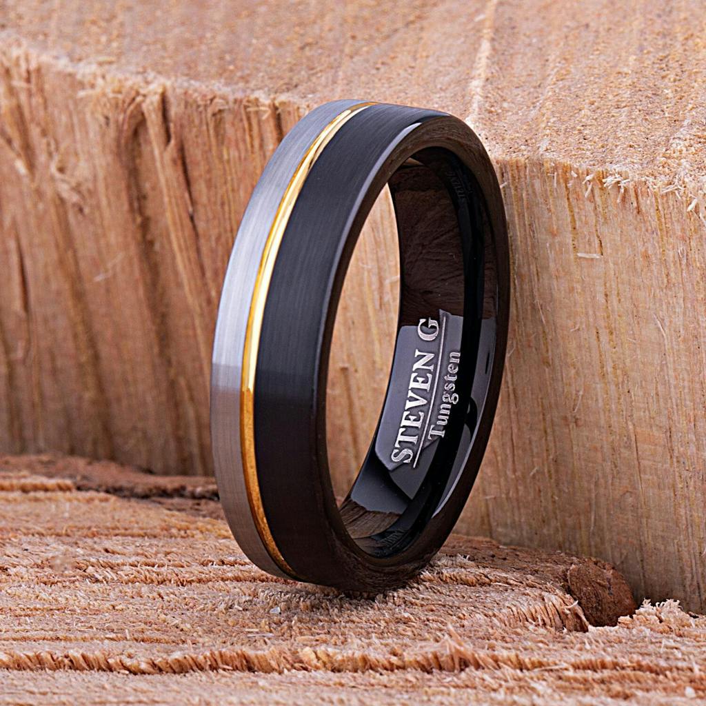 This is a unique style of tungsten band with a contrast of black, yellow, and gunmetal colors that looks elegant worn day or night. It is a difficult band to produce due to the 2 step plating process - but it's well worth the effort! It has a solid feel due to the density of the tungsten and professional workmanship. You won't find a better-made ring. It is built to be durable and last a lifetime. Make your friends envious. Get one for yourself today!