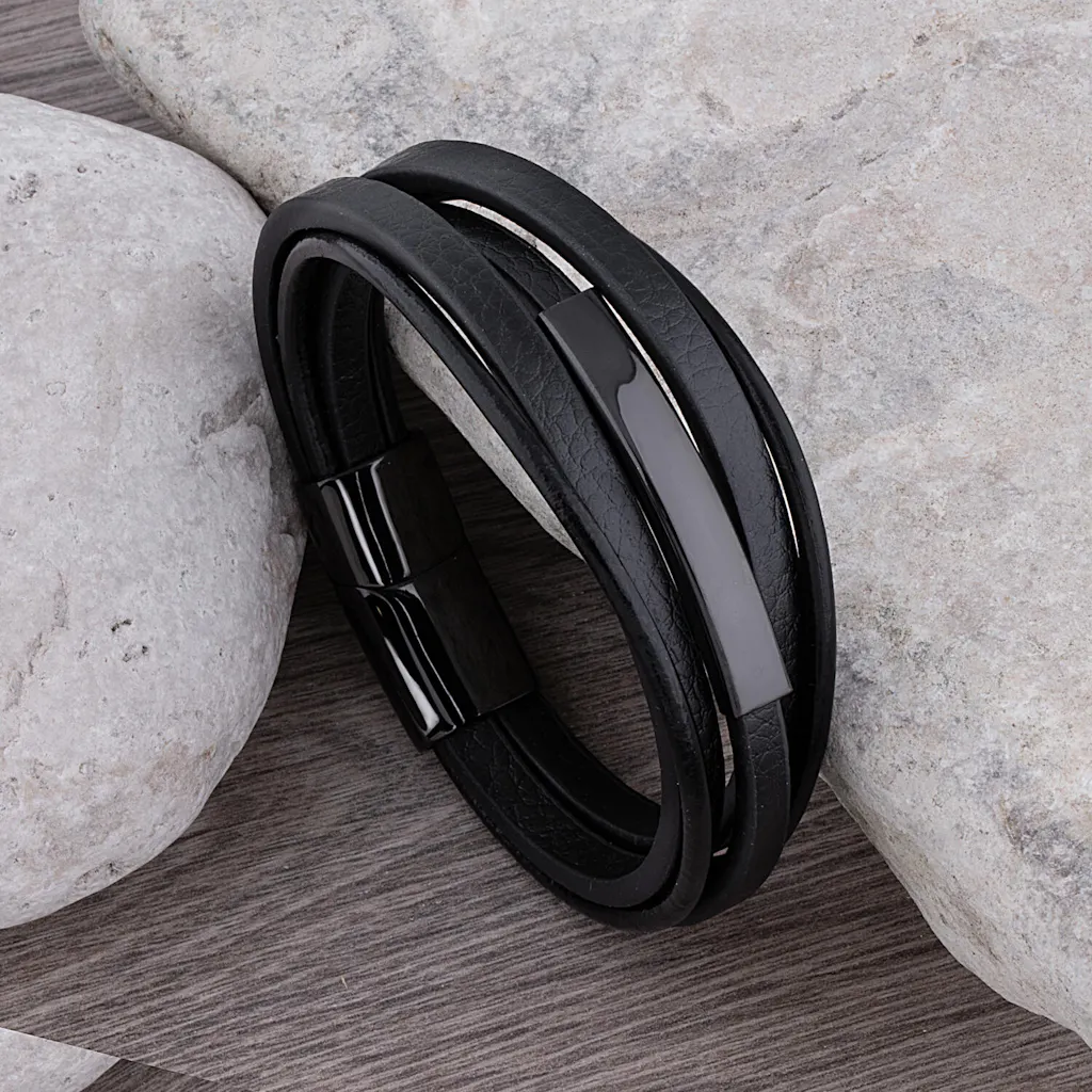 Crafted with meticulous attention to detail, this bracelet features multiple strands of superior quality black leather, carefully to create a strong and stylish design. The centerpiece is a durable stainless steel plate, providing the perfect canvas for personalization with custom engravings, making it a unique and meaningful accessory.