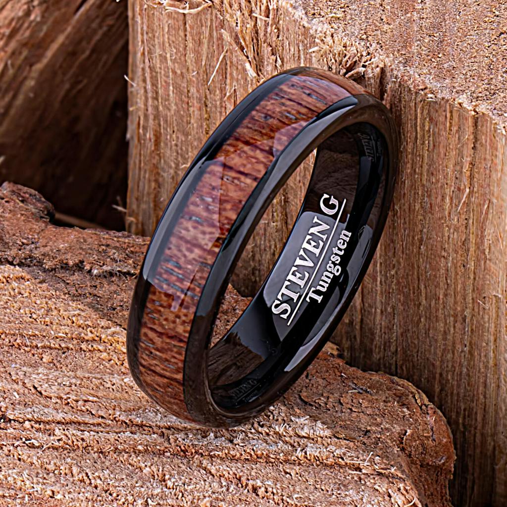 Tungsten Carbide Men's Wedding Band or Men's Engagement Ring 6mm Wide Black IP Plating Natural Padauk Wood Inlay