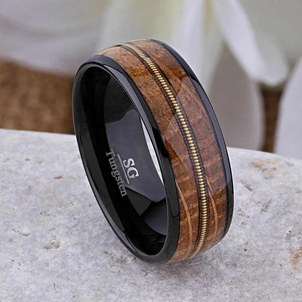 How could anyone possibly resist this eye-catching tungsten ring? This ring design is inlaid with a centered guitar string, beautiful whiskey wood and black plated for an extra touch of sophistication. It's the perfect accessory for any sophisticated gentleman. Whether you're attending a formal event or just wanting to add a little something special to your everyday look, this ring is sure to turn heads.